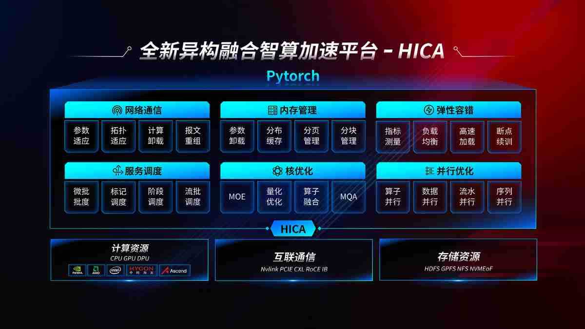 通过自研的服务层、、、、中间适配层、、以及调度编排算法,,,,采用数据并行、、模型并行等多种并行方式,,,,把并行计算任务进行有效的分解,,使其分别由相应的软件栈和算力资源来承接。。。。当GPU资源变化,,,HICA可以实时动态调度计算子任务并调整模型拓扑和架构,,,,以充分聚合各种算力资源。。
